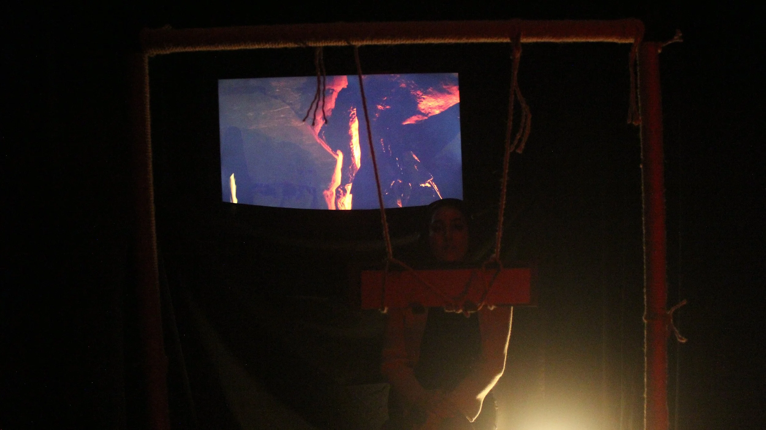 A minimal spatial narrative, this installation invites the viewer to follow the poem of 'Revert' facing away from the screen, and through a rear-view mirror. An extension of the poetic nature of this collaborative piece, the installation is low-tech, using rope to hang a mirror from a frame, resemblant of unjust execution of Iranian artist in the recent months and years.